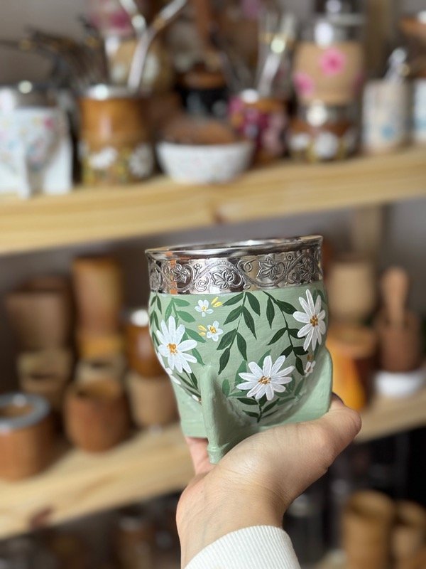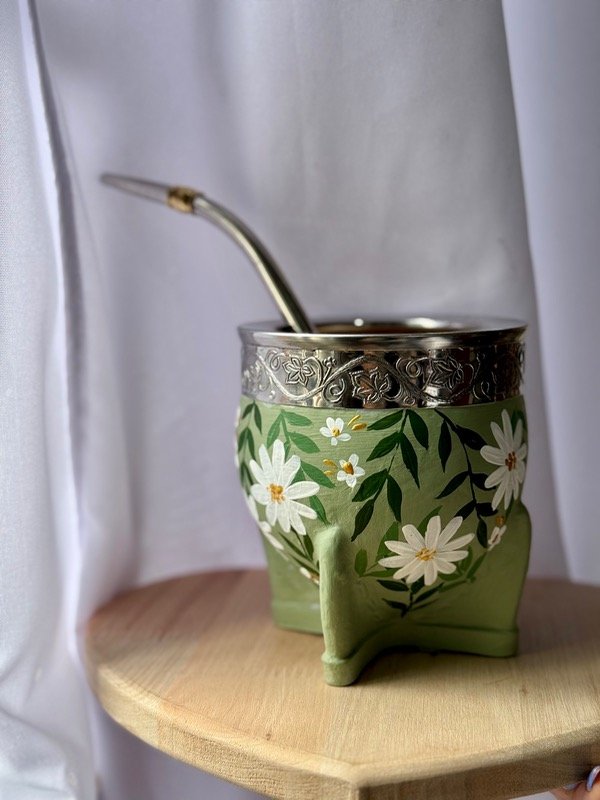 Mate de cuero con interior de calabaza, con diseño botánico pintado a mano y virola de alpaca 🧉🌸