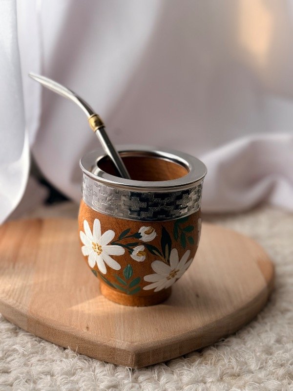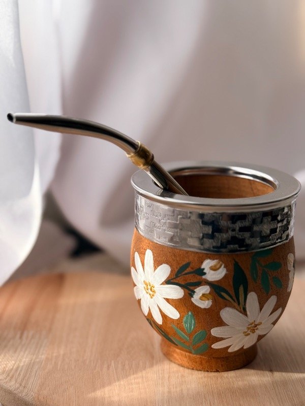 Mate imperial de algarrobo con virola en acero labrada con diseño. LAS VIROLAS VIENEN SURTIDAS, POR LO CUAL NO SON A ELECCIÓN. PUEDE SER CUALQUIERA DE LOS DOS DISEÑOS!