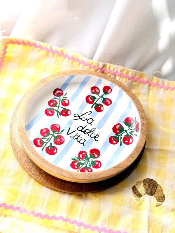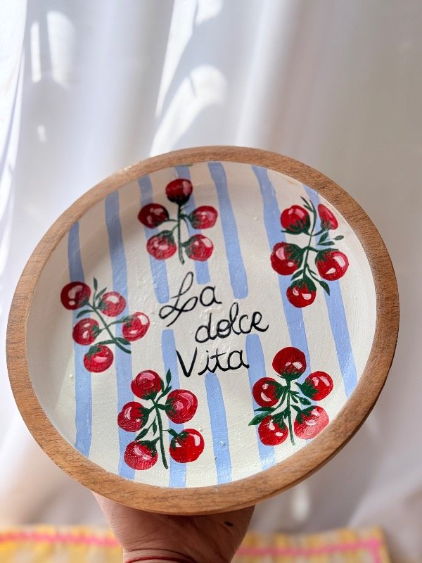 Fuente de madera pintada a mano con diseño estilo positano, con detalles unicos, ideal para presentar en tu mesa y dejarla unica 🍅✨🫶🏻