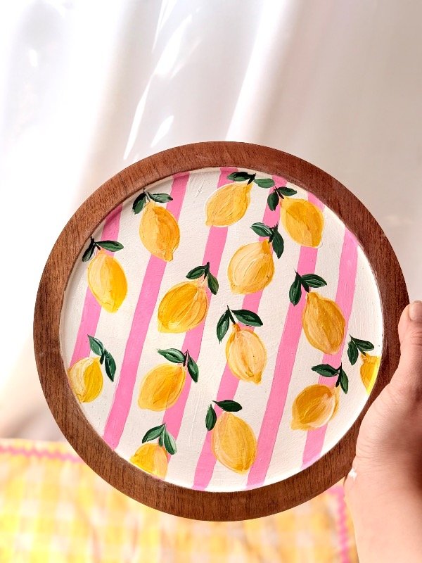 Plato de madera pintado a mano con diseño de limones, con detalles unicos, ideal para presentar en tu mesa y dejarla unica ✨🫶🏻