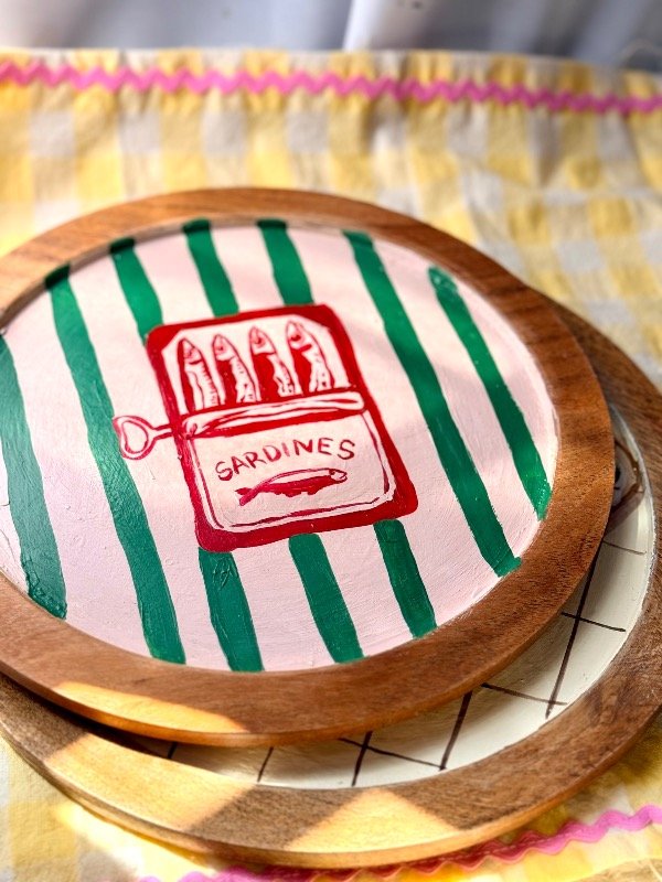 Plato de madera pintado a mano con diseño de sardinas, con detalles unicos, ideal para presentar en tu mesa y dejarla unica ✨🫶🏻
