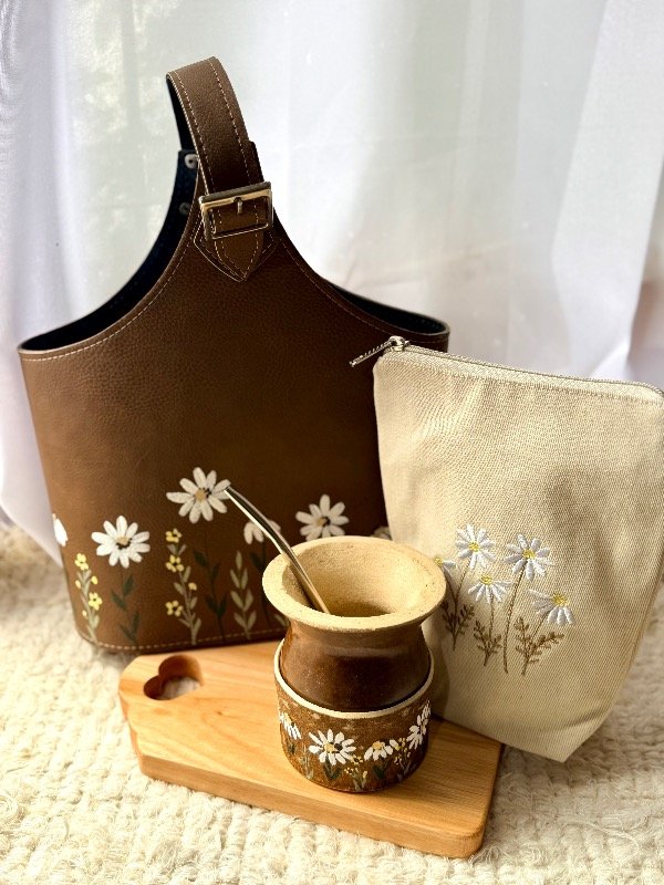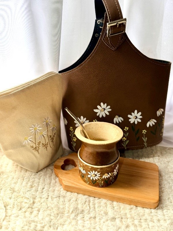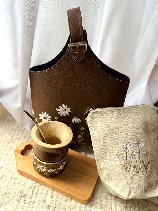 Incluye un mate de calabaza diseño campito, una matera de eco cuero haciendo juego y una yerbera bordada🍃