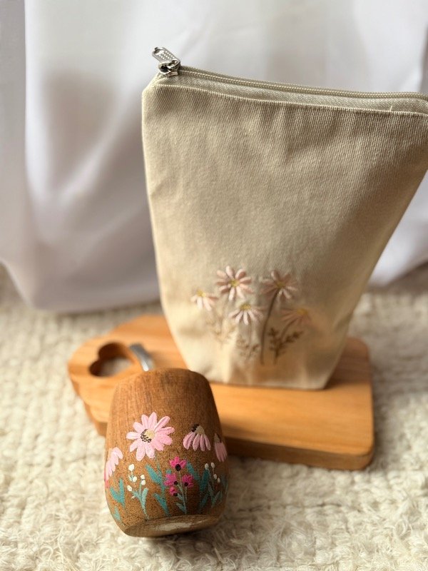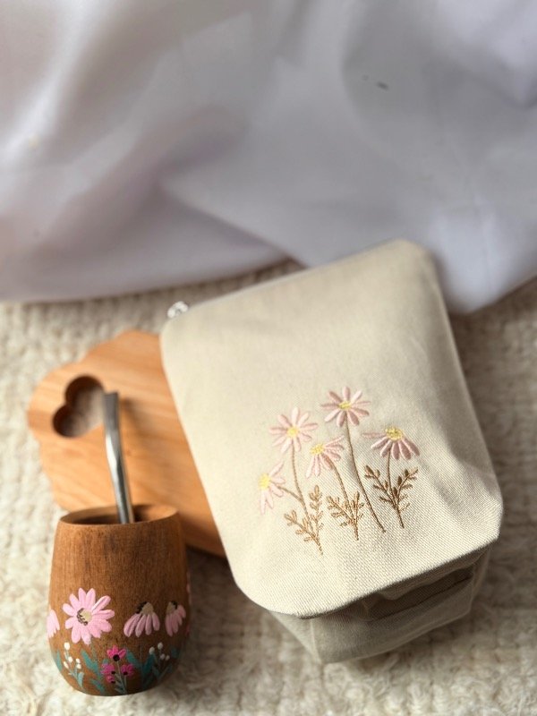 Incluye un mate de algarrobo diseño campito en tono rosa y una yerbera bordada haciendo juego🍃