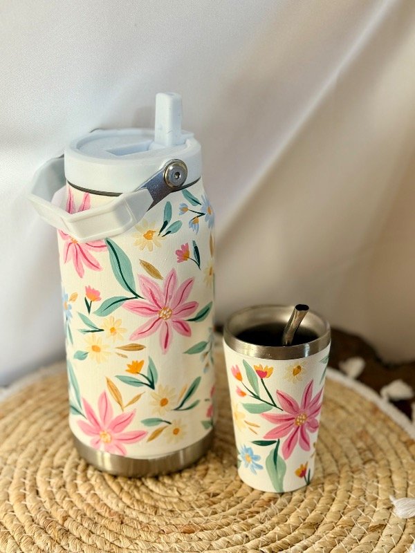 Incluye termo de 1200ml y vasito de acero con bombilla, todo pintado a mano 🫶🏻