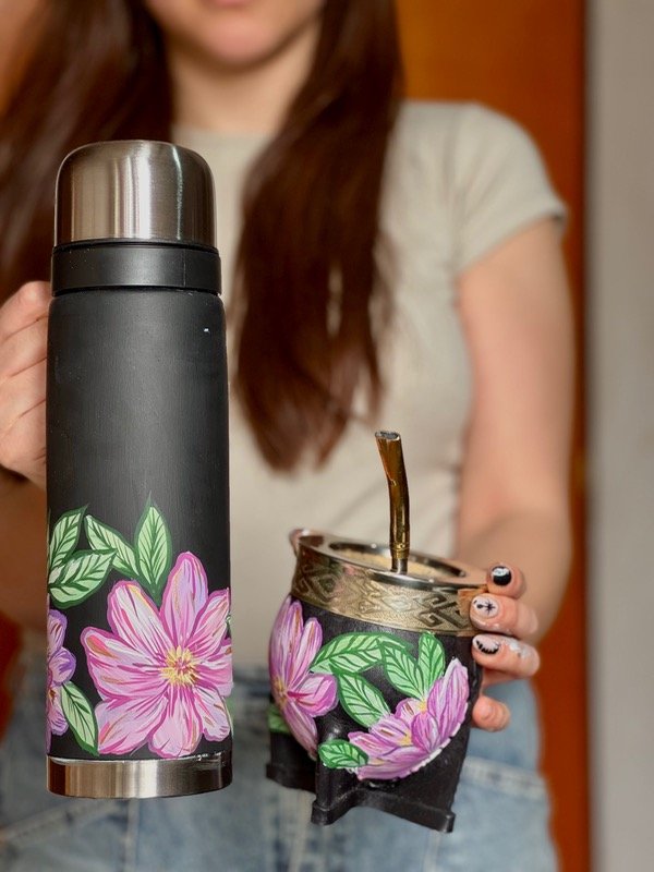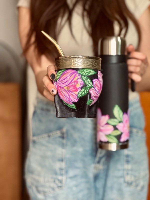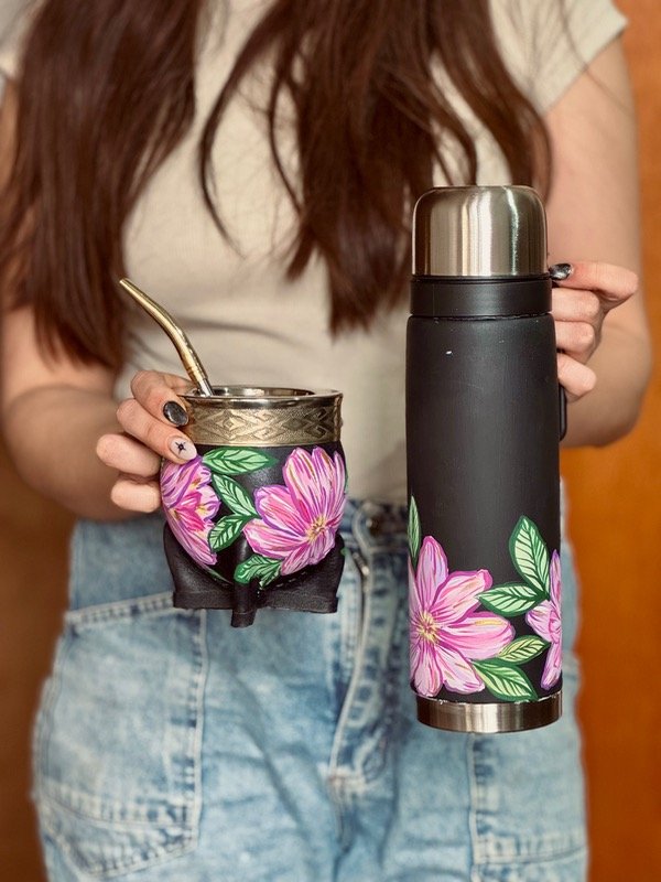 Set de termo de 1 litro con media manija y mate imperial de calabaza, forrado en cuero y virola de alpaca