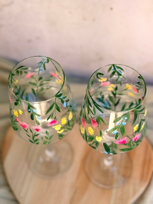 set de 2 de copas pintadas a mano con diseño botánico 🥂🌸